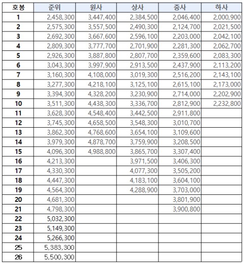 ▼더 많은 계급(장성급, 장교, 부사관) 2025년 봉급표 보러가기 ▼